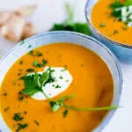 Let op: de soep zal licht pittig zijn. Wil je het minder pittig voeg dan minder van de curry toe. Of voeg eventueel een beetje meer water toe maar dat zal invloed hebben op de dikte van de soep. Een grotere dot Griekse yoghurt kan ook!