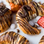 Haal de croissants uit de oven, laat even afkoelen (eventueel op een taartrooster, dan gaat het sneller) en leg daarna op iedere croissant een letter. Knip een heel klein puntje van het zakje met de gesmolten chocolade af en drizzle de chocolade over de croissants heen. Serveer direct.