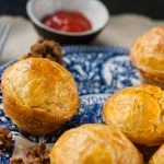 Maak nu de dakjes door een plak bladerdeeg over een gevulde cup te leggen en steek een rondje uit met een glas of mok. Druk de randen goed aan.