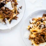 Roer de pulled pork door de tagliatelle en champignons heen en serveer met wat vlokken Parmezaanse kaas.