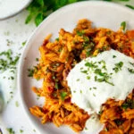 Roer de kipreepjes door de orzo heen en serveer met een dot tzatziki en wat van de verse fijngehakte peterselie.