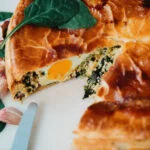 Stort in het bladerdeeg de vulling en verdeel gelijkmatig. Met een lepel maak je 5 kuiltjes waar je een ei in kunt breken (groot genoeg dus). Breek de 5 eieren in de kuiltjes en leg op de taart de tweede plak bladerdeeg. Druk aan bij de randen, en snijd het teveel aan deeg weg.