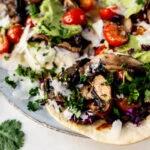 Wanneer de repen portobello mooi gebakken zijn, voeg je de tomaatjes toe en bak je deze nog even kort mee. Daarna kun je de tortilla's gaan beleggen: verdeel de avocadocrème over de tortilla's, daarna een handje rode kool, en dan de repen portobello en cherrytomaatjes. Maak af met nog een beetje fijngehakte koriander en flink wat Pecorino.