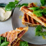 Leg het brood onder de hete contactgrill en grill de tosti's mooi bruin. Niet te lang, anders gaart de ossenworst teveel.