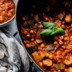 Verhit een beetje olijfolie in een stoofpan en voeg de ui en knoflook toe. Bak totdat de ui glazig is en voeg dan de champignons en de courgette toe. Bak even kort en voeg vervolgens de kikkererwten en tomatenblokjes toe. Roer even goed door.