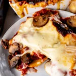 Voeg nu alles samen. Vet een ovenschaal in met een beetje olijfolie en verdeel een beetje tomatensaus over de bodem. Beleg de bodem vervolgens met de aardappelschijfjes en giet er een beetje tomatensaus overheen. Daar bovenop leg je alle plakken aubergine en tenslotte de champignons. Giet alle overige tomatensaus er overheen en maak af met de bechamelsaus.