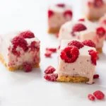 Druk nu de verse frambozen in de fudge. Schuif daarna in de koelkast om op te laten stijven. Een nachtje is het beste, maar als je hem op de dag zelf nog wil eten dan moet 4-6 uur voldoende zijn.