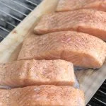 Draai de plank dan om en leg hem indirect op het rooster (aan de kant van de barbecue zonder kolen). Smeer de bovenkant van de rookplank in met olie en verdeel hier de zalmmoten overheen met de huid naar beneden.