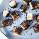 Snijd de rolletjes in stukjes en rol ze door de sesam.