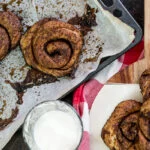 Schep 1 tl kaneelpoeder door de bruine basterdsuiker en strooi dit over het aanrecht.