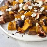 Verspreid de zoete aardappel over een groot bord en laat afkoelen. Snijd de vijgen in vieren en verdeel over de zoete aardappel.