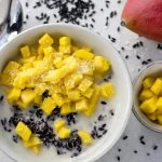 Giet de rijst af en vul er twee kommen mee. Voeg de kokosmelk eraan toe en verdeel de mango erover.