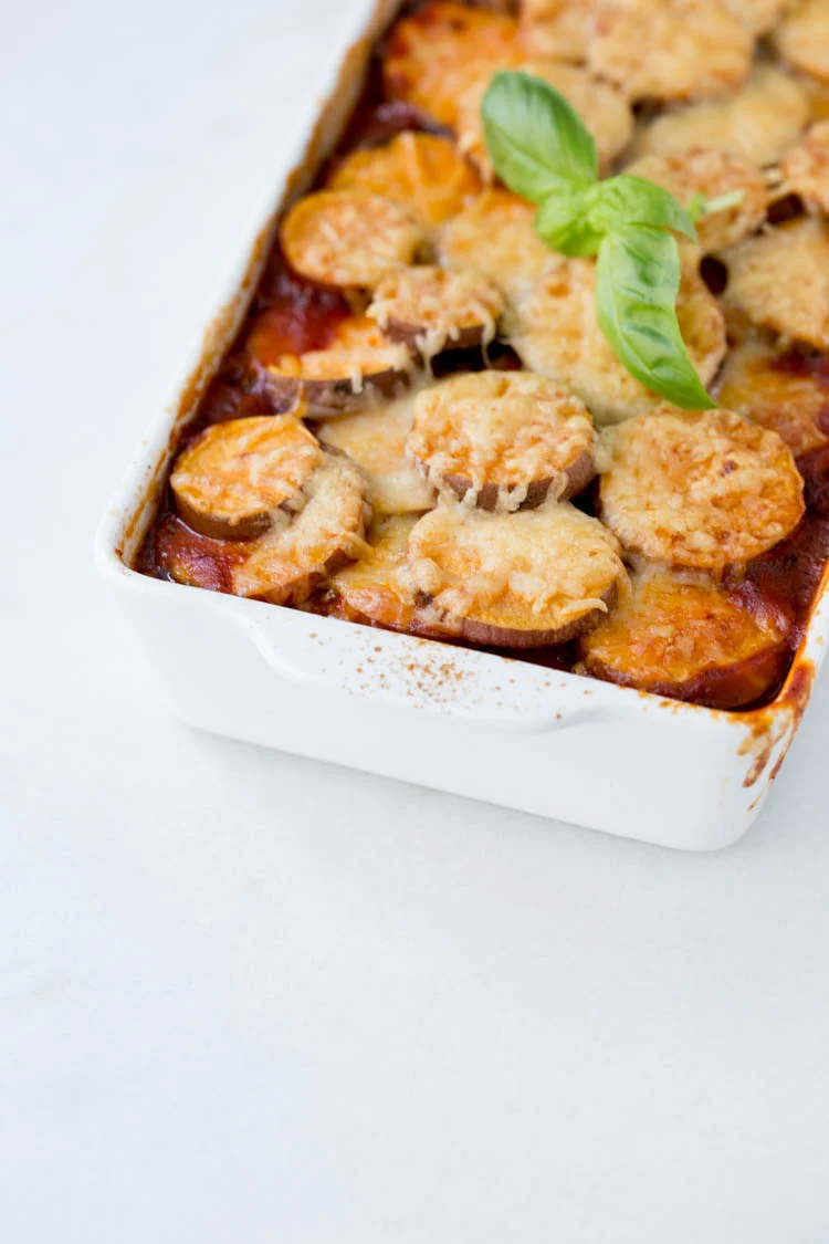 • Uiteindelijk doe je de tomaten/gehaktsaus in een ovenschaal en verdeel je de plakjes zoete aardappel erover. Sprenkel nog een beetje olijfolie over de zoete aardappel en strooi de geraspte kaas erover. Schuif in de oven voor een half uurtje. Klaar als de zoete aardappel gaar is (prik er even in met een vork om te testen of de zoete aardappel zacht is).