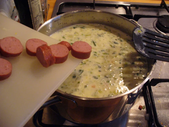 - Snijd de rookworst in plakjes en voeg ook deze toe aan de soep. Laat de soep nu ongeveer 15 minuten zachtjes koken.
